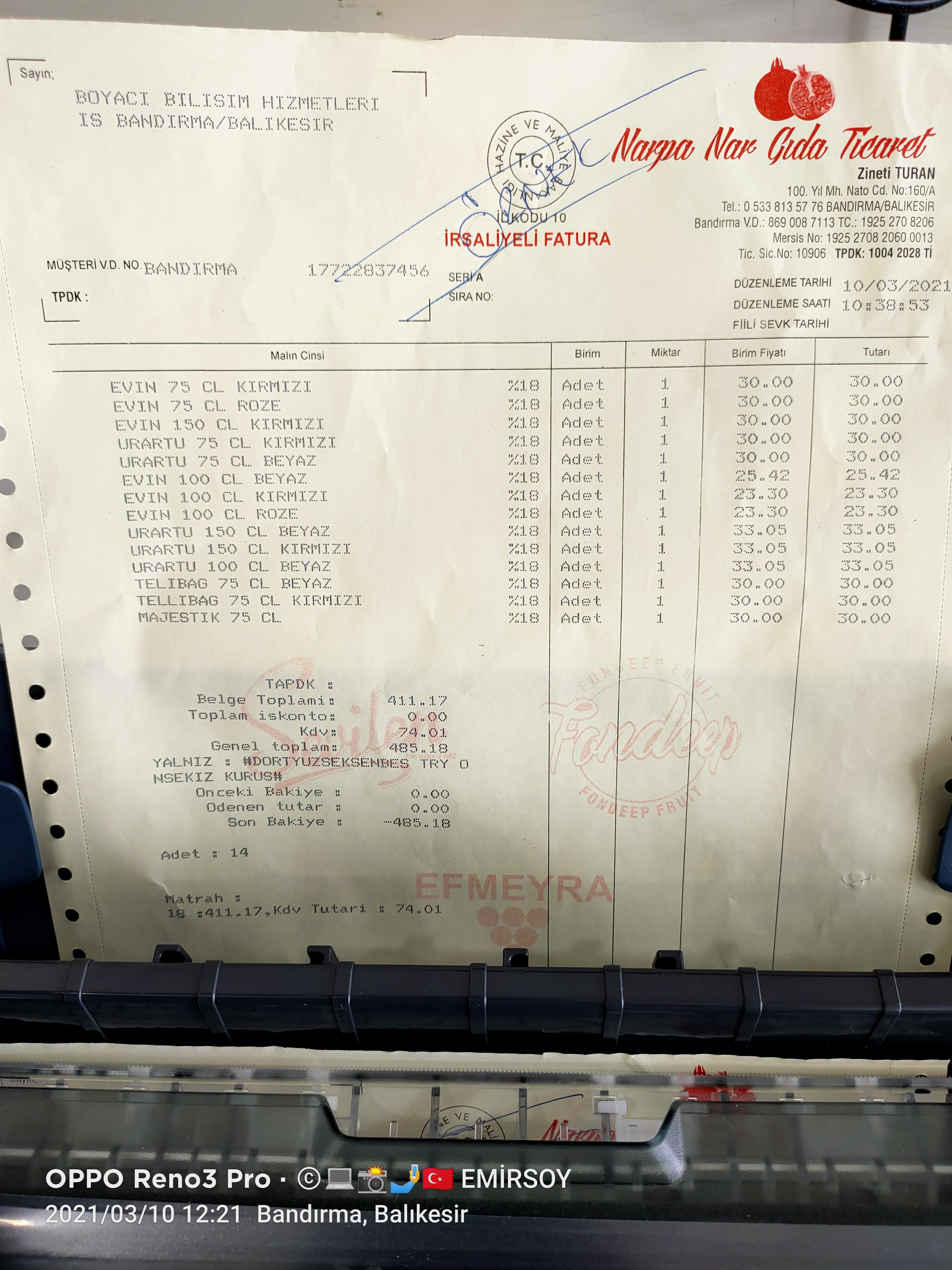 Narpa Nar Gıda Sevilen Şaraplar Bayii Bandırma/Balıkesir , Ön Muhasebe, Araçta Saha Satış, Araçata Fatura kesme Modülümüzle Boyacı Bilişim Hizmetleri ve Erp12 Tercih etti, Müşterimize Hayırlı olsun Başarılar Dileriz.